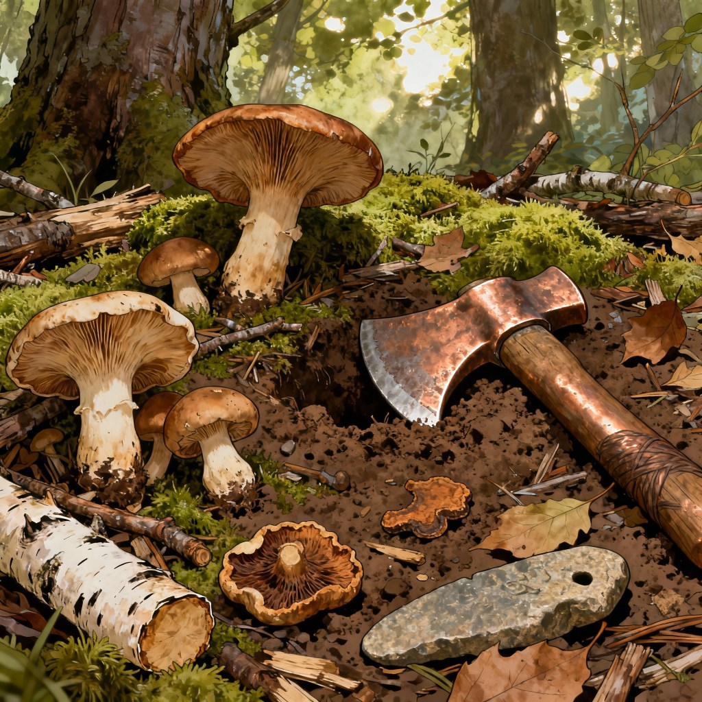 Bild: KI-generierte Illustration (Perplexity AI), künstlerische Darstellung von Pilzen und frühzeitlichen Werkzeugen im Wald